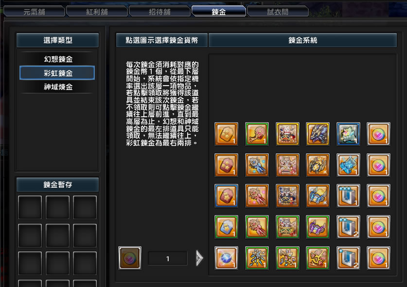 「彩虹鍊金」活動詳情: 於限時鍊金的開放時間內,玩家可於商城的元氣舖的「上架新品」區購買『彩虹幣使用券』,亦可於「鍊金」介面的「彩虹幣快速直購優惠」區使用元氣點數購買「彩虹幣」。